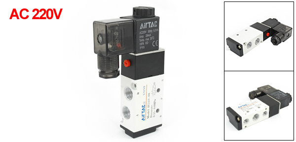 Product Name Solenoid Valve Model 4V210-08 Working Pressure 0.15~0.8Mpa Temp.rise 35 degree centigrade Voltage AC220V Current 29mA Power Consumption DC 24V:3.0W, AC 220V:2.0VA, AC 110V:2.5VA, AC380V:2.5VA Highest Action Frequency 5 Excitation Time =<0.05 Second Type Single-head, Double-position Position & Way Number Two-position, Five-way Joint Pipe Bore Inlet = Outlet = 1/8PT, Exhaust = 1/4PT Total Size 11.8 x 6.5 x 2.2cm/4.6'' x 2.6'' x 0.9'' (L*W*H) External Material Metal, Plastic Color Off White, Black Net Weight 214g Package Content 1 x Solenoid Valve - Reviews