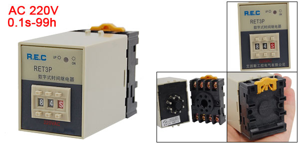 Product Name Time Relay + Socket Model RET3P Working Voltage AC 220V Contact Capacity AC 250V 3A Resistive Load Time Range 0.1 Second to 99 Hour Total Size (Approx.) 8.3 x 5 x 3.9cm/3.3" x 2" x 1.5"(L*W*H) Material Plastic, Metal Color As Picture Shown Weight 114g Package Content 1 x Time Relay