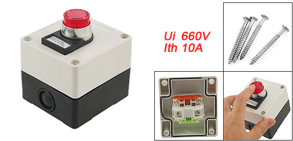 Product Name Push Button Station Material Plastic, Metal Ui 660V Ith 10A Lamp Voltage AC 220V Action Type Self Locking Contact Type 1NO, 1 NC Overall Size(not include button) 7.8 x 7 x 6.4cm/ 3" x 2.7" x 2.5" (L*W*H) Overall Height 8.2cm/ 3.2" Mounting Hole Diameter 5mm/ 0.2" Color Red, White, Black Weight 157g Package Content 1 x Push Button Station - Reviews