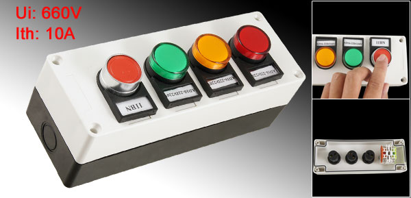 Product Name Push Button Station Switch Action Type Momentary Switch Contact Type 1NO 1NC Switch Ui: 660V Ith: 10A Lamp Voltage AC 220V Lamp Color Red, Green, Yellow Material Plastic, Metal Button Diameter(Approx.) 2.5cm/ 1" Overall Size(not include the button) 13.2 x 6.7 x 7.8cm/ 7.6" x 2.6" x 3" (L*W*H)