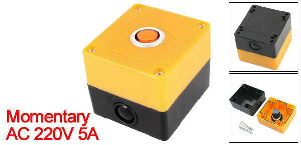 Product Name Push Button Station Action Type Momentary Type Hole Diameter 22mm/ 0.87" Ith AC 220V 5A Contact Type SPDT 1 NO 1 NC Box Size 78 x 72 x 64mm/ 3.1" x 2.8" x 2.5" (L*W*H) Switch Size 40 x 29mm/ 1.5" x 1.2" x 2.5"(H*Max.D) Mounting Hole Diameter 5mm/ 0.2" Mounting Hole Distance 64 x 58mm(Center to Center) Button Color Orange External Material Plastic External Color Black, Yellow Net Weight 110g Package Content 1 x Push Button Station