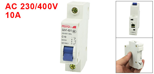 Product Name Circuit Breaker Model No. DZ47-63/1 Exrternal Material Plastic, Metal Rated Voltage AC 230/400V 50Hz Rated Current 10A Breaking Capacity 6000A Total Size (Approx.) 77 x 65 x 18mm/ 3" x 2.6" x 0.7" (L*W*T) Number of Poles 1 Mount Type 35mm DIN Rail Mounted Net Weight 90g Package Content 1 x Circuit Breaker - Reviews