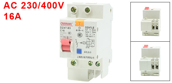 Product Name Miniature Circuit Breaker Model No. DZ47LE-63/1P Exrternal Material Plastic, Metal Rated Voltage AC 230/400V 50Hz Rated Current 16A Breaking Capacity 6KA Residual Current Breaker Residual Operating Current: 30mA