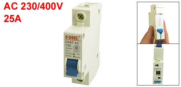 Product Name Circuit Breaker Model Number DZ47-63 C25 Rated Circuit Breaking Capacity 6000A Rated Current 25A Rated Voltage AC 230/400V Poles 1 Pole Rail Mounting 35mm DIN Rail Overall Size (Approx) 66 x 18 x 77mm/ 2.6" x 0.7" x 3" (L*W*T ) Material Plastic, Electric Components Color As Picture Shown Weight 82g Package Content 1 x Circuit Breaker - Reviews