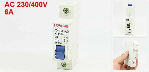 Product Name Circuit Breaker Model No. DZ47-63/1P C6 Exrternal Material Plastic, Metal Rated Voltage AC 230/400V 50Hz Rated Current 6A Breaking Capacity 6000A Total Size (Approx.) 77 x 65 x 18mm/ 3" x 2.6" x 0.7" (L*W*T) Number of Poles 1 Mount Type 35mm DIN Rail Mounted Net Weight 91g Package Content 1 x Circuit Breaker - Reviews