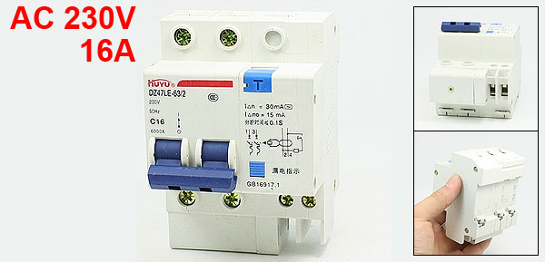 Product Name Miniature Circuit Breaker Model No. DZ47LE-63/2P C16 Exrternal Material Plastic, Metal Rated Voltage AC 230V 50Hz Rated Current 16A Breaking Capacity 6000A Residual Current Breaker Residual Operating Current: 30mA