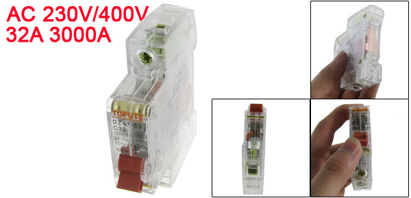 Product Name Miniature Circuit Breaker Model No. DZ47-63 C32 Feature Din Rail Mount, Transparent Rated Voltage AC 230V/400V Rated Current 32A Rated Breaking Capacity 3000A Number of Poles 1P Overall Size (Approx.) 80 x 18 x 72mm / 3.1" x 0.7" x 2.8"(L*W*H) Material Plastic, Electric Components Weight 77g Package Content 1 x Miniature Circuit Breaker - Reviews