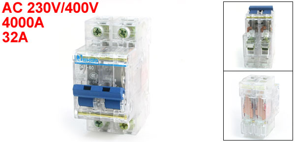 Product Name Miniature Circuit Breaker Model Number DZ47-60 C32 Rated Circuit Breaking Capacity 4000A Rated Voltage AC 230V/400V 50HZ Rated Current 32A Poles 2 Pole for Wire Size 6mm2 Rail Mounting 35mm DIN Rail Overall Size (Approx) 78 x 74 x 36mm/3.1" x 2.8" x 0.15" (L*W*T ) Material Plastic, Electric Components Main Color Clear Net Weight 151g Package Content 1 x Miniature Circuit Breaker - Reviews
