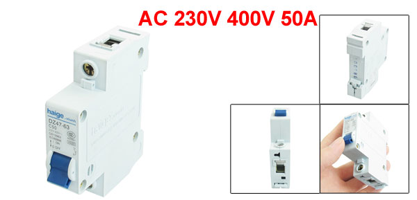 Product Name Miniature Circuit Breaker Model No. DZ47-63 C50 Rated Voltage AC 230V/400V Rated Current 50A Rated Breaking Capacity 4500A Number of Poles 1P Overall Size (Approx.) 77 x 66 x 20mm / 3.0" x 2.6" x 0.79" (L*W*T) Material Plastic, Electric Components Weight 99g Package Content 1 x Miniature Circuit Breaker - Reviews