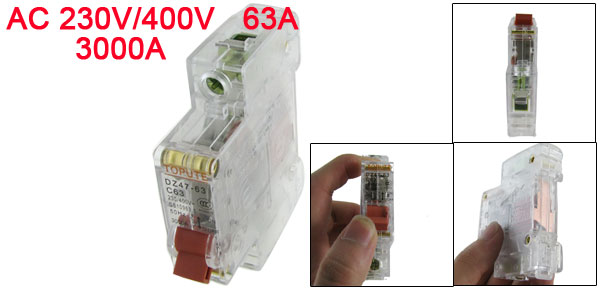 Product Name Miniature Circuit Breaker Model No. DZ47-63 C63 Feature Din Rail Mount, Transparent Rated Voltage AC 230V/400V Rated Current 63A Rated Breaking Capacity 3000A Number of Poles 1P Overall Size (Approx.) 80 x 18 x 72mm / 3.1" x 0.7" x 2.8"(L*W*H) Material Plastic, Electric Components Weight 76g Package Content 1 x Miniature Circuit Breaker - Reviews