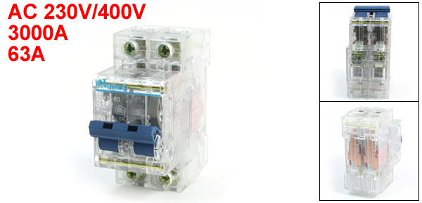 Product Name Miniature Circuit Breaker Model Number DZ47-60 C63 Rated Circuit Breaking Capacity 3000A Rated Voltage AC 230V/400V 50HZ Rated Current 63A Poles 2 Pole Rail Mounting 35mm DIN Rail Overall Size (Approx) 78 x 74 x 36mm/3.1" x 2.8" x 0.15" (L*W*T ) Material Plastic, Electric Components Main Color Clear Net Weight 153g Package Content 1 x Miniature Circuit Breaker - Reviews