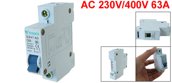 Product Name Circuit Breaker Model No. DZ47-63 C63 Material Plastic, Electric Components Rated Voltage AC 230V/400V Rated Current 63A Breaking Capacity 4000A Frequency 50/60Hz Total Size (Approx.) 77 x 18 x 65mm/ 3" x 0.7" x 2.6" (L*W*H) Number of Poles 1 Mount Type DIN Rail Color As Picture Shown Weight 92g Package Content 1 x Circuit Breaker - Reviews