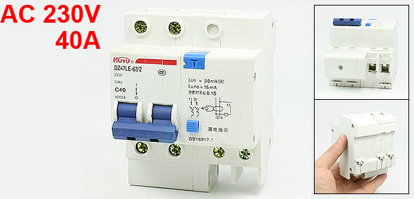 Product Name Miniature Circuit Breaker Model No. DZ47LE-63/2P C40 Exrternal Material Plastic, Metal Rated Voltage AC 230V 50Hz Rated Current 40A Breaking Capacity 4000A Residual Current Breaker Residual Operating Current: 30mA