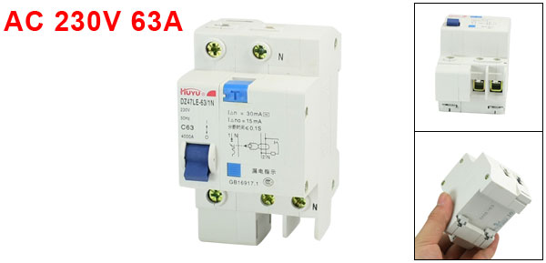 Product Name Miniature Circuit Breaker Model No. DZ47LE-63/1N C63 Exrternal Material Plastic, Metal Rated Voltage AC 230V 50Hz Rated Current 63A Breaking Capacity 4000A Residual Current Breaker Residual Operating Current: 30mA