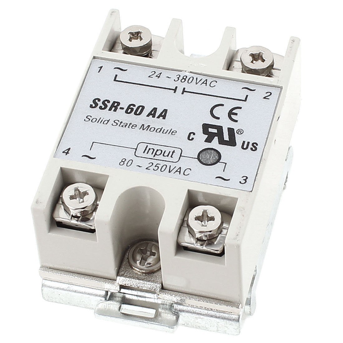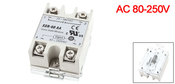 Product Name Solid State Relay Model SSR-60DA Control AC 80-250V Output AC 24-380V 60A Screw Terminal 4 Phase Single Phase Mounting Type 35mm DIN Rail Mounting Relay Size 60 x 45 x 23mm/ 2.4" x 1.8" x 0.91"(L*W*T) Spring Leagth 21mm/0.83" Total Size (Approx.) 80.5 x 46.5 x 40mm/3.1" x 1.8" x 1.6"(L*W*T)