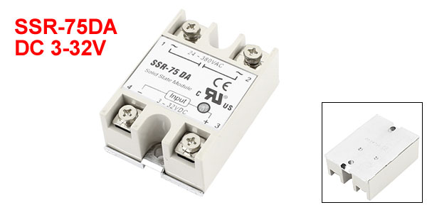 Product Name Solid State Relay Type SSR-75DA Input DC 3-32V Rated Current 75A Output AC 24-380V Total Size (Approx.) 63 x 45 x 23mm/ 2.5" x 1.8" x 0.91"(L*W*T) Material Plastic, Electric Part Color Gray, Silver Tone Weight 128g Package Content 1 x Solid State Relay