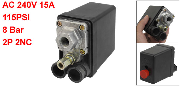 Product Name Air Compressor Pressure Switch Type 1 Ports Poles 2P 2NC Max. Voltage AC 240V Current 15A Pressure 115PSI, 8 Bar Port Size 1/4" (NPT) Bronze Tone Connector 11.5mm/0.45"(Hex), 6mm/0.24" Black Connector Inner Dia. 15.7mm/0.62" Total Size 12.7 x 8.2 x 5.1cm/5" x 3.23" x 2" (L*W*T) Button Diameter 2cm/ 0.8" Material Metal, Plastic Main Color Black, Red Net Weight 283g Package Content 1 x Air Compressor Pressure Switch - Reviews