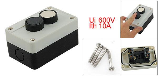 Product Name Push Button Station Material Plastic, Metal Ui 600V Ith 10A Working Voltage AC 240V Working Current 3A Uimp 6KV Action Type Momentary Contact Type 2 NO Button Size (Approx.) 3 x 1cm / 1.18" x 0.39" (D * H ) Box Size (Approx.) 10.3 x 6.6 x 5cm / 4" x 2.59" x 1.96" (L * W * T) Mounting Screw Hole Diameter (Approx.) 8.5mm / 0.33" Color Black, White Weight 164g Package Content 1 x Push Button Station - Reviews