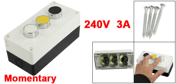Product Name Push Button Station Material Plastic, Metal Ui 600V Ith 10A Umip 6kV Working Voltage AC 240V 3A Action Type Momentary Contact Type 3 NO Button Dia 2.8cm / 1.1" Box Size (Approx.) 14.9 x 7 x 6.4cm / 5.8" x 2.7" x 2.5" (L * W *T) Mounting Screw Hole Diameter (Approx.) 5mm / 0.19" Color White, Black, Yellow Weight 300g Package Content 1 x Push Button Station - Reviews