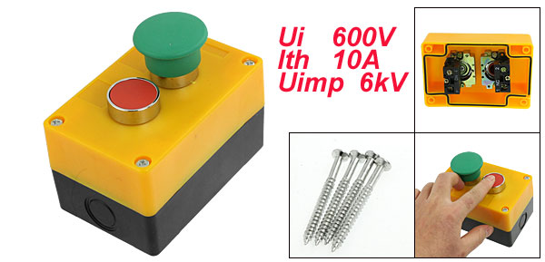 Product Name Push Button Station Material Plastic, Metal NO Green Switch Ui: 600V Ith: 10A Uimp: 6kV Working Voltage: AC 240V 3A NC Red Switch AC 400V 10(6)A Action Type Momentary Contact Type 1 NO 1 NC Button Size (Approx.) Green: 4 x 2.7cm / 1.57" x 1" (D * H ) Red: 2.8 x 0.8cm/1.1" x 0.3"(D * H ) Box Size (Approx.) 10.8 x 7 x 6.4cm / 4.2" x 2.7" x 2.5" (L * W *T) Mounting Screw Hole Diameter (Approx.) 5mm / 0.19" Color Green,Red, Black, Orange Weight 241g Package Content 1 x Push Button Station - Reviews