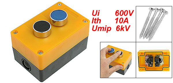 Product Name Push Button Station Material Plastic, Metal Ui 600V Ith 10A Umip 6kV Working Voltage AC 240V Working Current 3A Action Type Momentary Contact Type NO Button Size (Approx.) 2.8 x 1cm / 1.1" x 0.39" (D * H ) Box Size (Approx.) 10.8 x 7 x 6.4cm / 4.2" x 2.7" x 2.5" (L * W *T) Mounting Screw Hole Diameter (Approx.) 5mm / 0.19" Color Blue, Black, Orange Weight 220g Package Content 1 x Push Button Station - Reviews