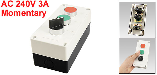 Product Name Push Button Station Action Type Momentary Contact Type 2 NO, 1 NC(Red) NC Switch Ui: 600V Ith: 10A Uimp: 6KV Rating: AC 240V 3A NC Switch AC 400V 10(6)A Overall Size(not include the button) 15 x 7 x 6.4cm/ 5.9" x 2.8" x 2.5" (L*W*H) Button Diameter 2.5cm / 1" Material Plastic Color White, Black(Case), Red, Green, Black Weight 317g Package Content 1 x Push Button Station - Reviews