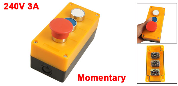 Product Name Push Button Station Action Type Momentary Contact Type 2 NO, 1 NC(Red) NO Switch Ui: 600V Ith: 10A Uimp: 6KV Rating: AC 240V 3A NC Switch AC 400V 10(6)A Overall Size(not include the button) 15 x 7 x 6.4cm/ 5.9" x 2.8" x 2.5" (L*W*H) Button Diameter 2.5cm / 1", 4cm/ 1.6" Material Plastic Color Yellow, Black(Case), Red, White, Blue Weight 318g Package Content 1 x Push Button Station - Reviews