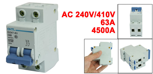 Product Name Miniature Circuit Breaker Model DZ47-63 C63 Material Plastic, Electric Components Type C63 Rated Voltage AC 240V/410V Rated Current 63A Breaking Capacity 4500A Total Size (Approx.) 7.7 x 7.3 x 3.6cm / 3" x 2.9" x 1.4" (L * W * T ) Number of Poles 2 Weight 166g Package Content 1 x Miniature Circuit Breaker - Reviews