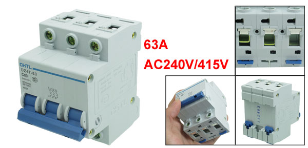 Product Name Miniature Circuit Breaker Model Number DZ47-63 C63 Rated Circuit Breaking Capacity 4500A Rated Current 63A Rated Voltage AC240V/415V Number of Poles 3 Overall Size (Approx.) 7.7 x 6.6 x 5.3cm / 3" x 2.6" x 2.1"(L*W*T ) Material Plastic, n Electric Components Color As Picture Shown Weight 262g Package Content 1 x Miniature Circuit Breaker - Reviews