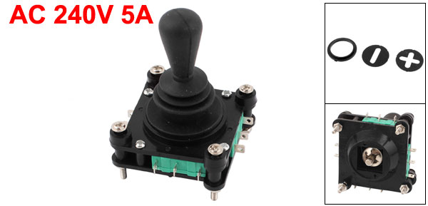 Product Name Joystick Switch Material Plastic, Metal Voltage Current AC 240V 5A Action Type Momentary Contact Type 4NC 4NO(Each Micro Switch Has 1NO 1NC) Handle Diameter 14.5mm/0.57" Total Size 47 x 47 x 67mm/1.85" x 1.85" x 2.64"(L*W*H) Fixing Thread Diameter 2.5mm/0.098"