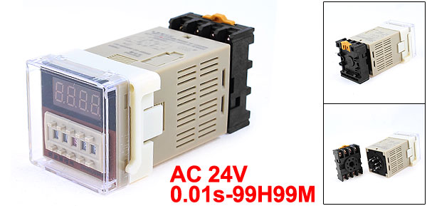 Product Name Time Relay w Base Socket Model Number DH48S-2Z Contact Resistive Load AC 250V 3A Rated Voltage AC 24V Contact Type DPDT, 2NO 2NC Number of Terminals 8 Pins Time Range 0.01s-99H99M External Material Plastic, Metal, Electric Parts Fixing Hole Dia 3mm/0.12" Mounted Hole Distance 33mm/ 1.3" Total Size 110 x 60 x 50mm / 4.3" x 2.4" x 2"(L*W*H) Net Weight 135g Package Content 1 x Time Relay w Base Socket