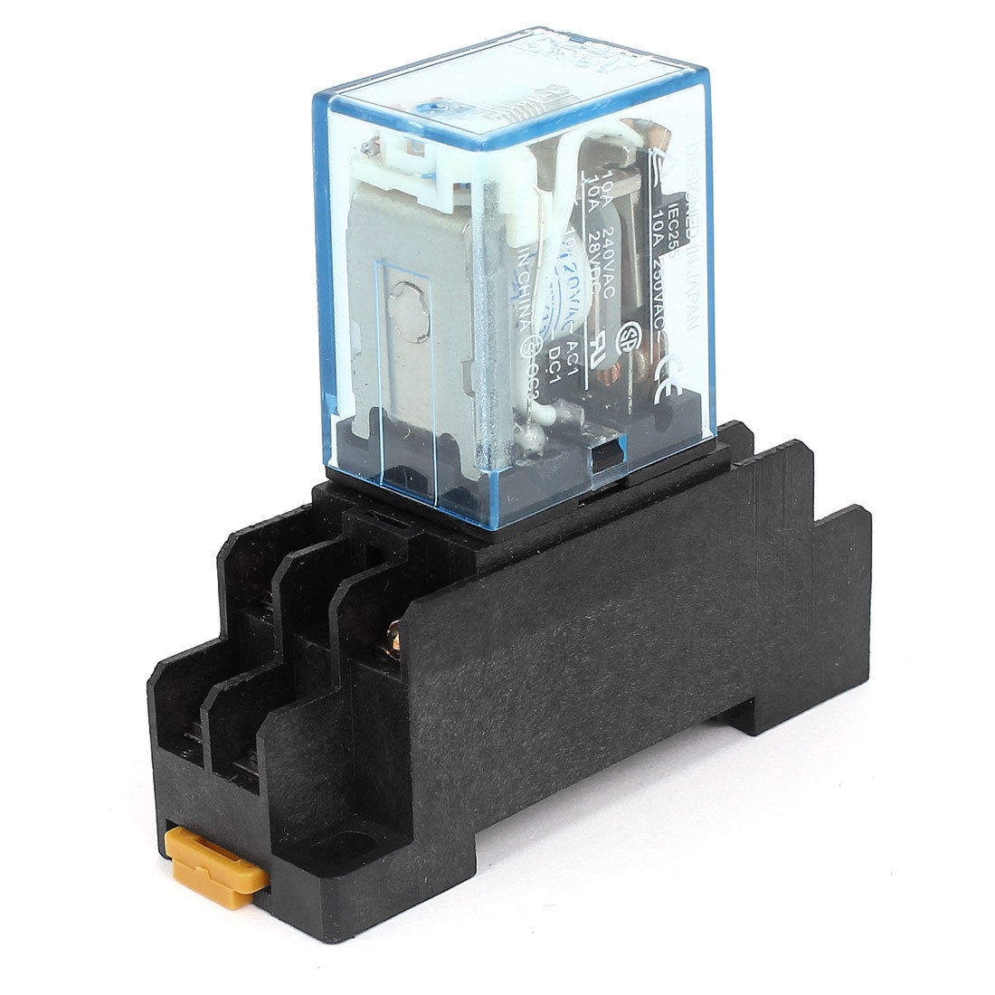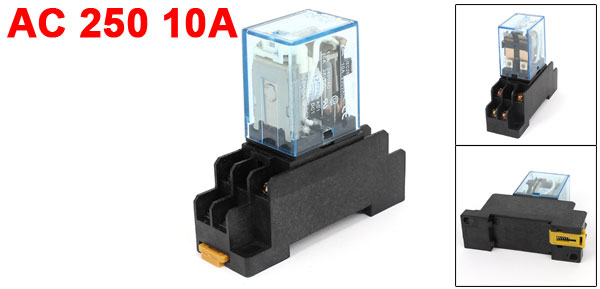 Main Color Black, Clear Blue Country of Manufacture CHINA Material Plastic, Electric Parts Lamp Color Red Relay Size (Approx.) 35 x 21 x 27mm/1.4" x 0.83" x 1"(L*W*H) Net Weight 56g Mount Rail Type 35mm DIN Rail Package Content 1 x Electromagnetic Relay Contact Capacity AC 240V 10A , DC 28V 10A Voltage AC 250 10A Socket Size 70 x 22 x 29mm/2.76" x 0.87" x 1.1"(L*W*H) Number of Terminals 8 Fixing Mount Hole Size 6 x 4mm/0.24" x 0.16"(L*W) - Reviews