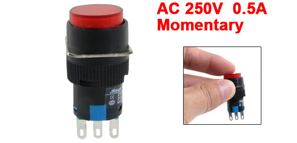 Item Name Momentary Push Button Switch Type Momentary, 1NO, 1NC Voltage & Current AC 250V, 0.5A DC 24V, 1A Button Color Red Overall Size 4 x 1.8cm / 1.6" x 0.7" (L * W) Button Diameter 1.5cm / 0.6" Material Plastic, Metal Net Weight 6g Package Content 1 x Momentary Push Button Switch - Reviews