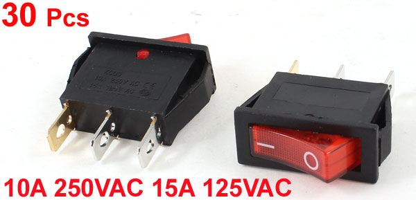 AC 250V/10A 125V/15A 3 Pins SPST Red Light Snap in Boat Rocker Switch 30 Pcs