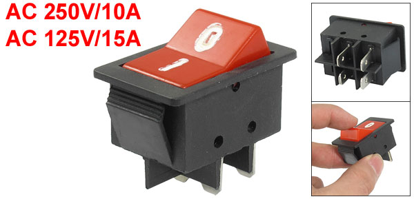 Product Name Rocker Switch Poles SPST Terminals 4 Pin Rating Voltage AC 250V/10A, AC 125V/15A Total Size(Each One) 3 x 2.5 x 3.5cm / 1.1" x 1" x 1.3"(L * W * T) Mount Hole Size 32 x 20mm / 1.1" x 0.8"(L*W) Color Black, Red Material Plastic, Metal Total Weight 13g Package Content 1 x Rocker Switch - Reviews