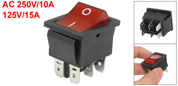 Product Name Rocker Switch Poles DPDT Terminals 6 Pin Rating Voltage AC 250V/10A, AC 125V/15A Total Size(Each One) 3 x 2.5 x 3.5cm / 1.1" x 1" x 1.3"(L * W * T) Mount Hole Size 32 x 20mm / 1.1" x 0.8"(L*W) Color Black, Red Material Plastic, Metal Total Weight 13g Package Content 1 x Rocker Switch - Reviews