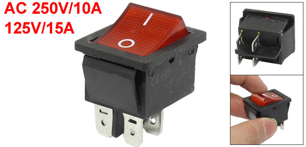 Product Name Rocker Switch Poles DPST Terminals 4 Pin Rating Voltage AC 250V/10A, AC 125V/15A Total Size(Each One) 3 x 2.5 x 3.5cm / 1.1" x 1" x 1.3"(L * W * T) Mount Hole Size 32 x 20mm / 1.1" x 0.8"(L*W) Color Black, Red Material Plastic, Metal Total Weight 13g Package Content 1 x Rocker Switch - Reviews