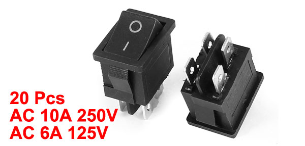 Product Name Rocker Switch Action DPST Terminals 4 Pin (ON-OFF) Rating Voltage 10A 250VAC 6A 125VAC Total Size 2.1 x 1.5 x 2.9cm/0.83" x 0.59" x 1.1"(L* W *T) Mounting Dimension 1.8 x 1.2cm/0.7" x 0.47"(L*W) Color Black, Silver Tone Material Plastic & Metal Total Weight 89g Package Content 20 x Rocker Switch - Reviews