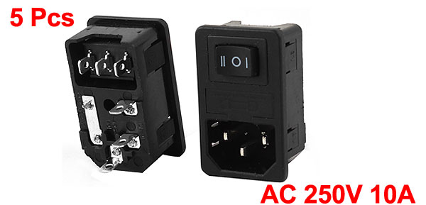 Product Name Power Inlet Socket Power Supply AC 250V 10A Plug Type IEC 320 C14 Rocker Switch Type 3Pin, 3 Position; SPST Button Color Black Mounting Type Clamp Type Mount Size 4.7 x 2.8cm/1.85" x 1.1"(L*W) Overall Size 5 x 3.1 x 3cm / 2" x 1.2" x 1.2" (L*W*T) Fuse Size 5 x 20mm / 0.2" x 0.8" (D*L) Material Plastic, Metal Color Black, Silver Tone Net Weight 115g Package Content 5 x Power Inlet Socket w Rocker Switch w Fuse - Reviews