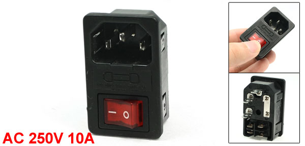 DetailsAC 250V 10A 4 Terminal Red Rocker Switch C14 Inlet Male Power Socket  Product Name Male Power Plug Power Supply AC 10A 250V Inlet Plug Type IEC320 C14 Terminals Number 3 Total Size(Approx) 5 x 3 x 3.1cm / 2" x 1.18" x 1.22"(L*W*T) Fit for Fuse Size 24 x 5mm / 0.94" x 0.19"(L*D) Mouting Hole 49 x 26mm / 1.92" x 1.02"9L*W) Material Plastic,Electronic Parts Color Black & Red Weight 21g Package Content 1 x Male Power Plug