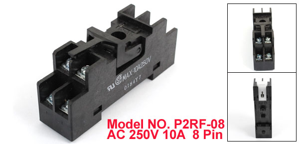 Product Name Relay Base Model NO. P2RF-08 Pin Quantity 8 Power AC 250V 10A Total Size (Approx.) 7 x 3 x 2cm / 2.8" x 1.2" x 0.8" (L* W *T) Mounting Rail Width 35mm/ 1.4" Hole Dia 6.5cm/ 0.26" Material Plastic, Metal Main Color Black Weight 37g Package Content 1 x Relay Base - Reviews