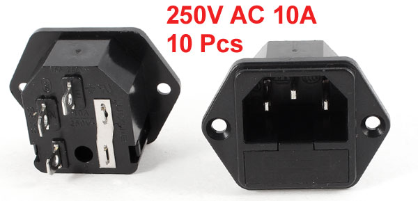 Product Name Power Inlet Socket Power Supply AC 250V 10A Plug Type IEC 320 C14 Pins Number 3 Mounting Type Screw Type Mounting Size 3.05 x 2.65 x 2.7cm / 1.2" x 1.04" x 1.1" (L*W*T) Mounting Screw Pitch 3.5cm / 1.38" Overall Size 4.4 x 3.3 x 3.2cm / 1.7" x 1.3" x 1.3" (L*W*T) Fit Fuse Size 5 x 23mm / 0.2" x 0.9" (D*L) Material Plastic, Metal Color Black, Silver Tone Net Weight 130g Package Content 10 x Power Inlet Sockets - Reviews