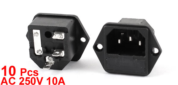 Product Name Power Inlet Socket Power Supply AC 250V 10A Plug Type IEC 320 C14 Pins Number 3 Mounting Type Screw Type Mount Hole Dia 3mm/0.12" Overall Size 4.4 x 3.3 x 3.1cm / 1.7" x 1.3" x 1.2" (L*W*T) Fuse Size 5 x 20mm / 0.2" x 0.8" (D*L) Material Plastic, Metal Color Black, Silver Tone Net Weight 138g Package Content 10 x Power Inlet Sockets - Reviews