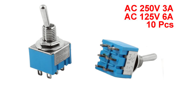 Product Name Toggle Switch Model MTS-2 Material Metal & Plastic Type DPDT(Latching) Switch Function ON/ON, 2 Position Terminal 6 Power AC 250V 3 A,AC 125V 6A Threaded Diameter 5.5mm/2.2' Screw Width 2.5mm/0.1'' Size 12.6 x 12.6 x 32mm/0.5'' x 0.5'' x 1.25'' (L*W*H) Color Blue & Silver Tone Weight 57g Package Content 10 x Toggle Switches - Reviews
