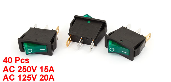 AC 250V/15A 125V/20A 3-Pin Green Light Lamp SPST On/Off Rocker Switch 40PCS