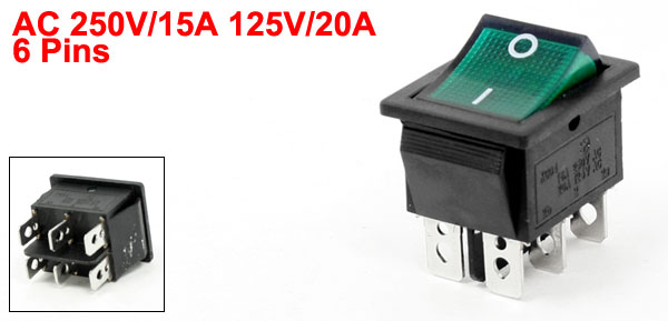 AC 250V/15A 125V/20A 6 Pins DPDT I/O Green Light Snap in Boat Rocker Switch