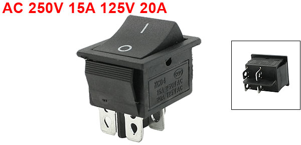 DetailsAC 250V 15A 125V 20A Black ON/OFF Snap In Boat Rocker Switch  Product Name Rocker Switch Poles DPST Terminals 4 Pin (On-Off) Mounted Hole Size 31 x 22 mm/ 1.2" x 0.9"(L*W) Rating Voltage AC 250V 10A