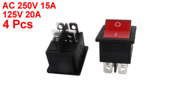 DetailsAC 250V/15A 125V/20A DPDT 6-Pin Soldering 2 Position Rocker Switch 4 Pcs  Main Color Black Red Product Name Rocker Switch Net Weight 49g Overall Size 35 x 32 x 25mm / 1.4" x 1.3" x 1" (L*W*T) Brand DMiotech Rated Voltage AC 250V 15A AC 125V 20A Pole DPDT Country of Manufacture CHINA Package Content 4Pcs x Rocker Switches Model KCD4 Material Plastic, Metal