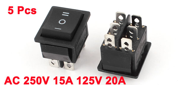 DetailsAC 250V 15A 125V 20A DPDT ON-OFF-ON 3 Position 6pin Boat Rocker Switch 5Pcs  Main Color Black Brand DMiotech Country of Manufacture CHINA Model KCD4 Material Plastic, Metal Contact Type DPDT, 3 Position (ON-OFF-ON) Total Size 3.1 x 2.5 x 3.5cm / 1.2" x 1" x 1.4"(L* W *T) Pins 6 Product Name Rocker Switch Net Weight 59g Mounting Size 27 x 21mm / 1.1" x 0.8" (L*W) Package Content 5pcs x Rocker Switch Rating AC 250V 15A 125V 20A