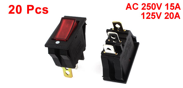 AC 250V 15A 125V 20A Red Lamp SPST 2 Position 3pin Snap in Rocker Switch 20Pcs